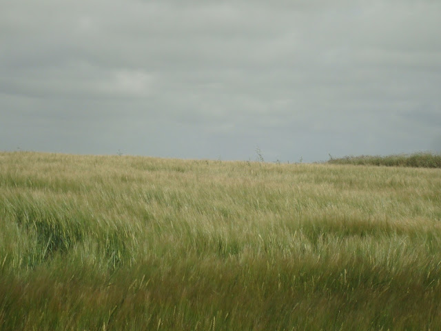 If somebody has a garden he/she has a lot of work to do. All the time there are weeds growing. In my garden I have many ferns and brambles. The foxgloves and campions have finished flowering and they look a mess. I pulled out a big heap. I had company - a blackbird singing on an electricity pole and a robin looking for insects. But I can't (and I don't want to) work for a long time. I need to walk among the meadows and fields. Can you distinguish different types of corn? Wheat stalks are stiff and straight (and the wheat is still green). But I prefer the barley - it looks like velvet or fur with its hairy ears, moving in the wind. The barley is starting to turn yellow. And I had to look at the gate stone again! Is this a cross?
